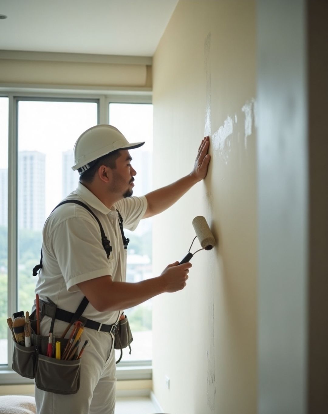 如果牆壁上有裂縫、破損、凹凸不平等狀況,要記得重新補土,保持牆面平整,粉刷的效果會比較好。特別提醒,補土後建議靜置一天,待批土完全乾燥再開始粉刷牆面。